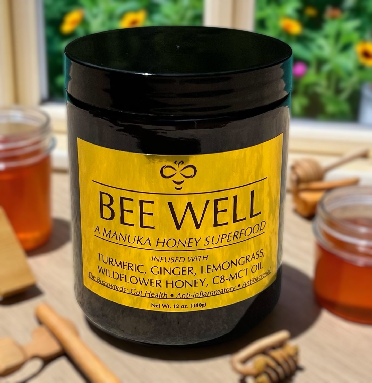 Bee Well - A harmonious fusion of nature’s finest ingredients. Crafted with pure Manuka and Wildflower Honeys, invigorated with Ginger, Turmeric, and Lemongrass, this blend offers a delightful taste experience while supporting your overall well-being. Enjoy it straight from the jar, mix it with warm water, or stir it into your favorite tea for a comforting and nourishing treat. Discover the power of nature’s golden elixir.